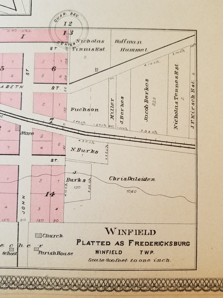 The 1904 map shows the area platted as Fredericksburg in Winfield Township in DuPage County Illinois. This is now know as the Village of Winfield. Christopher Daleiden owned a substanial amount of property in the Village at this time. His home in lot number 3 and 4 was near and to the north of the Church, Parish House and School of St. John the Baptist Roman Catholic Church. Source: 1904 Atlas of DuPage County Illinois, Illinois Digial Archives.