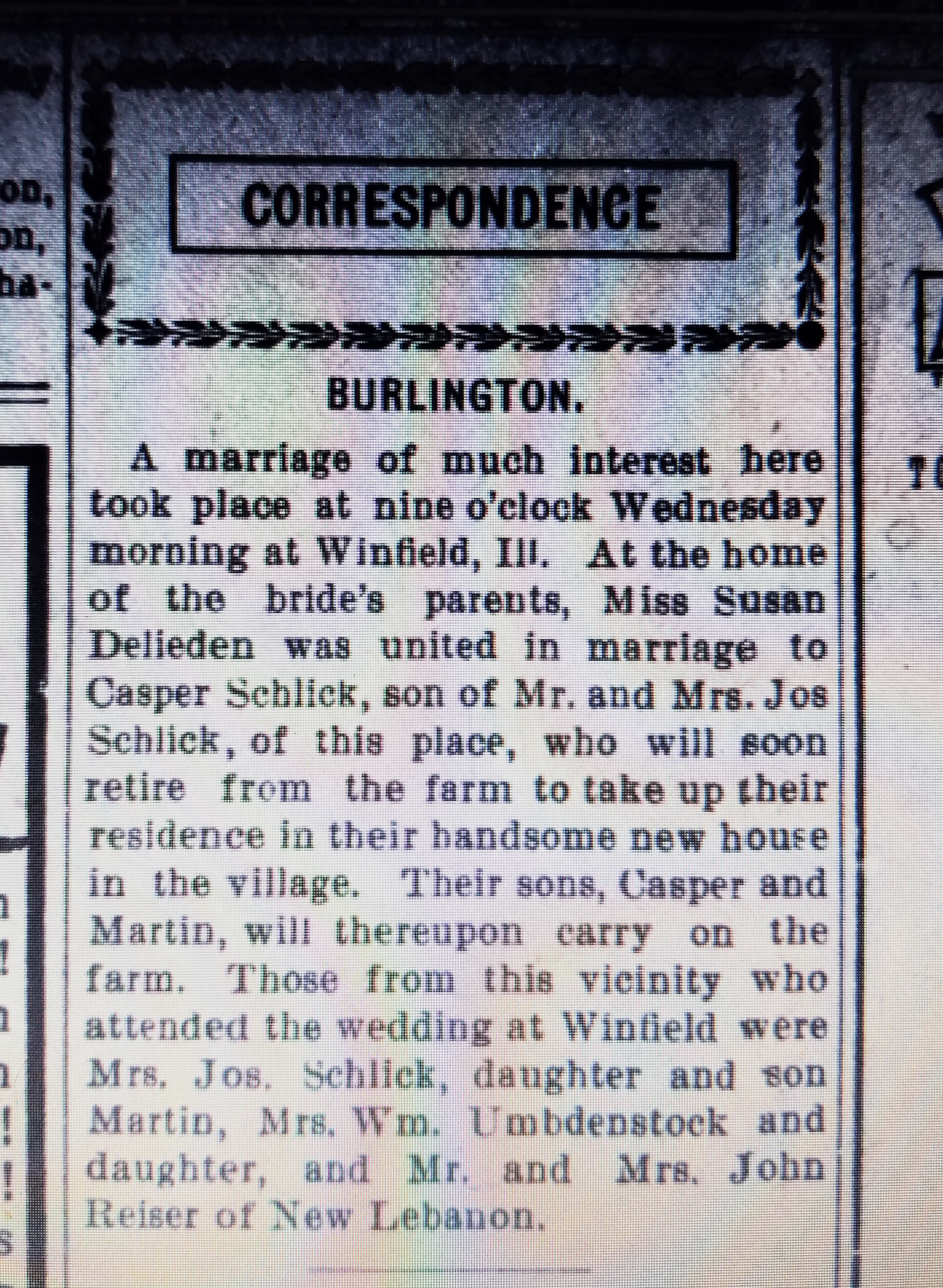 Newspapers contain local events and news during a particular time and era. Newspapers such as the Hampshire (Illinois) Register published in Hampshire Illinois in Kane County provided extremely helpful accounts on news and events in the lives of the Joseph and Mary Ann Schlick family of Burlington Illinois in Kane County. Most newspapers of the era contained columns that collected news from family and neighbors on family events and lives. The articles can add some meat to your writing and compiling of your family history. They were the Facebooks of their time. I concentrated on the local town columns. They were the Facebooks of their time. I was able to obtain ( in the 1980s) copies of the newspaper on microfilm from the Illinois Sate Historical Library in Springfield Illinois via my local library’s Interlibrary Loan Services. To locate newspapers where ones relative lived anywhere in the United States begin with the Library of Congress website on newspapers.