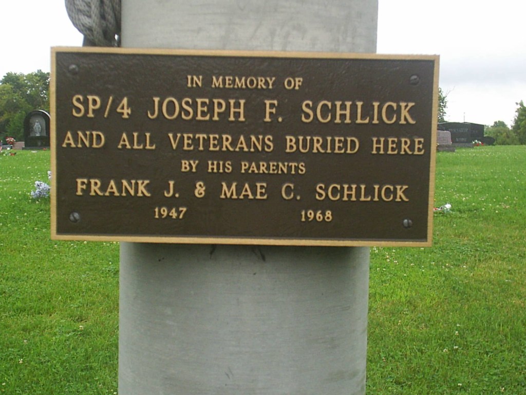 Mae died in 1989 and her husband, my grandfather, died in 1993. My mother Louise Davis died in November 1994. My uncle Joseph Schlick was killed in 1968 while serving in the Vietnam War. The Schlicks are all together now side by side at Assumption Cemetery located in Winfield Township Dupage County Illinois. The Cemetery is about a quarter mile south of Illinois Route 38 (Roosevelt Road) on Winfield Road.