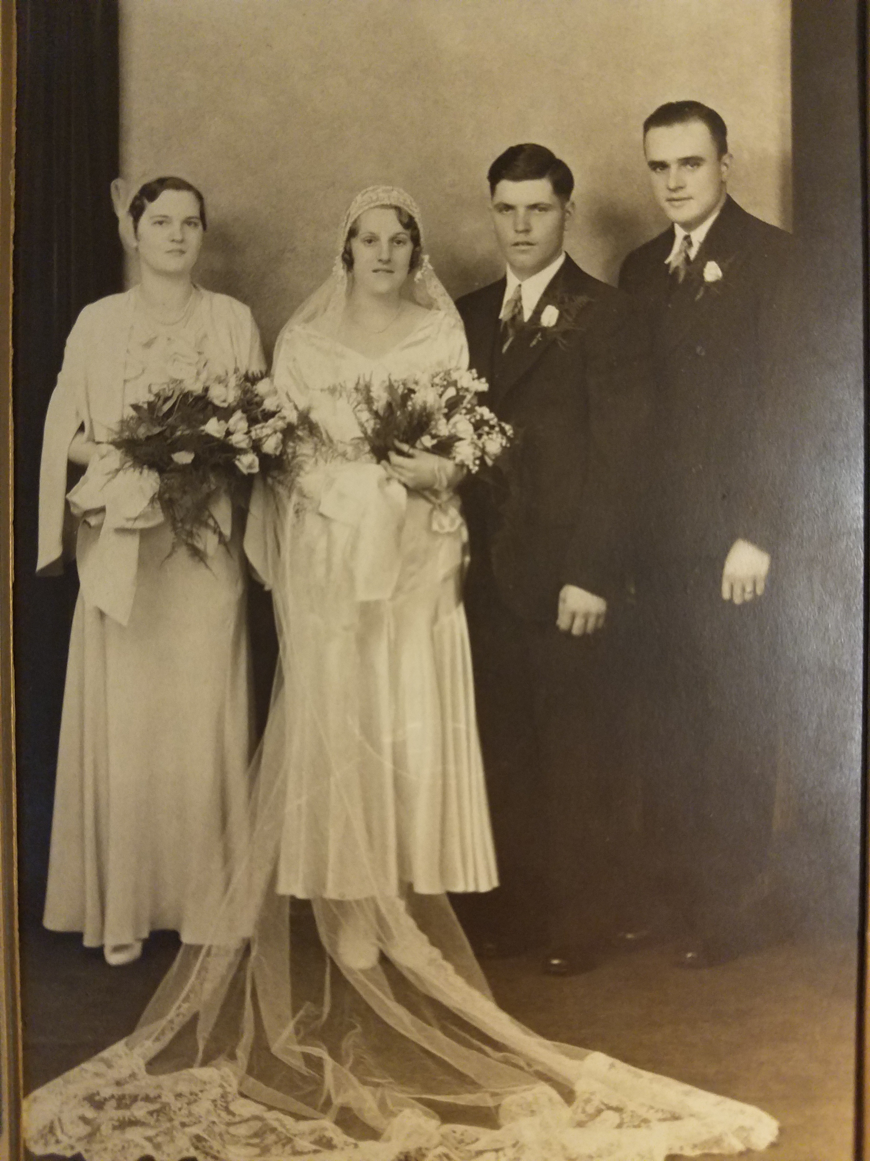 In photo above is from left to right: Lucille Schlick (Maid of Honor), Mae Catherine Hodous (The Bride), Francis (Frank) J. Schlick (The Groom), and Robert Hodous (Best Man, Mae the bride’s oldest brother),