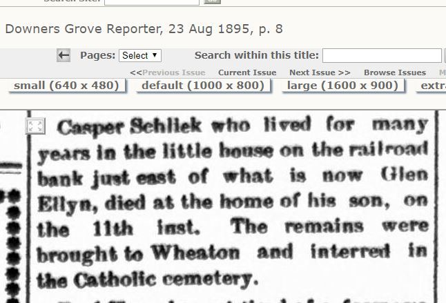 One item that will need further investigation is the discrepancy of Casper’s acutal death date. Per one newspaper account it is reported as 20th of August 1895. Another account records his death as the 11th of August. An account written by a relative (Loretta Hermann the daughter of Joseph L. Schlick, Jr.) provides a date of 13 August 1895. The Kane County Death Certificate lists the date of 12 August 1895. His headstone has the date of 2 October 1895. I will have to investigate further why this may have occurred. For the current blog posting I am going by the Death Certificate date of 12 August 1895.