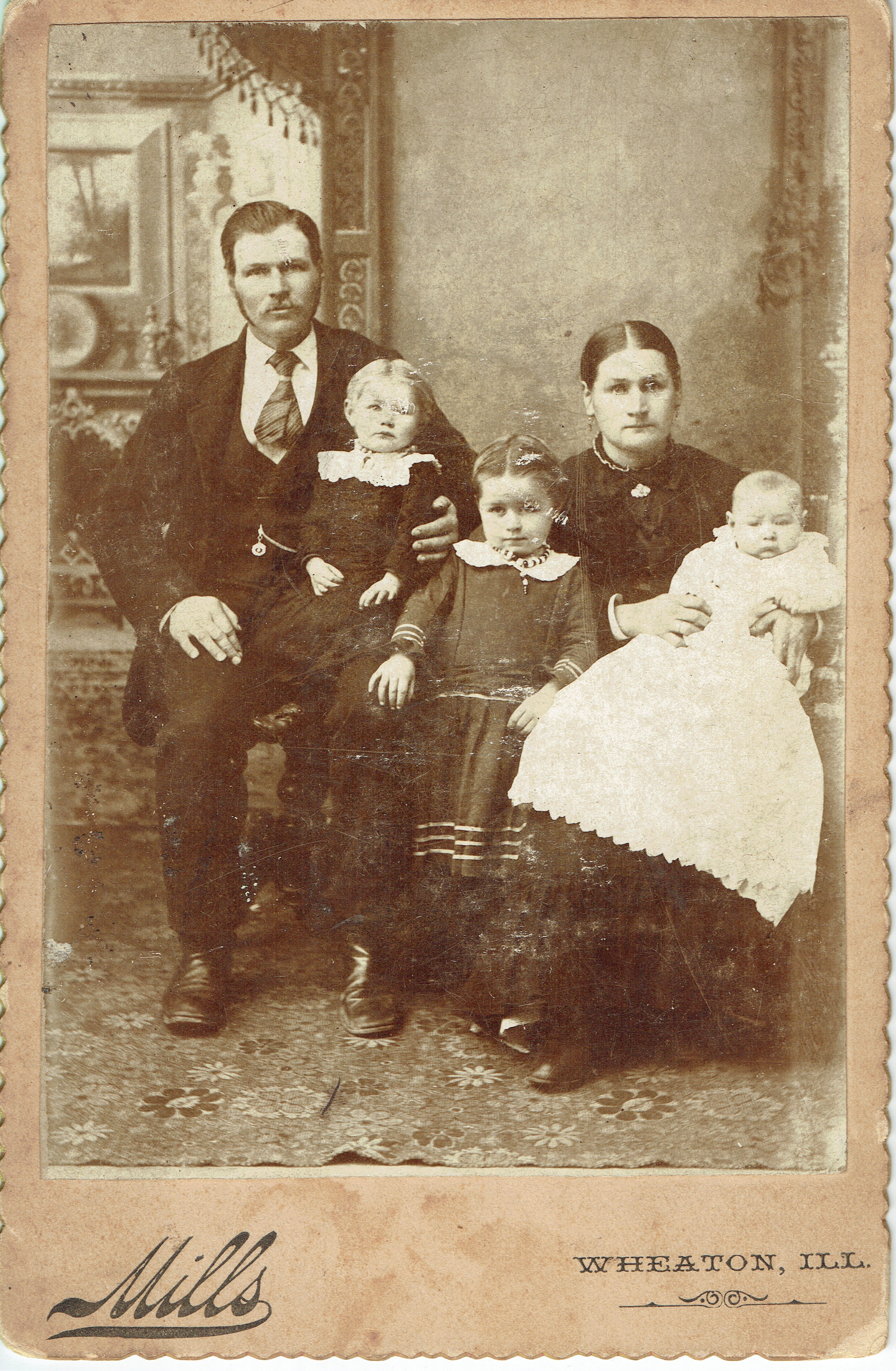 The Martin Armbrust family of DuPage County Illinois. Standing in the back row: Joseph (Joe), Anthony, Louis and Frank Armbrust. Front row seated: Mary Anna (Armbrust) Schlick*, Martin Armbrust, Sr., Anna Mary (Munsinger) Armbrust and Mrs. Martin (Caroline Armbrust) Sittler. (*= Note: Mary Anna married Joseph Schlick of Glen Ellyn and moved to Burlington to raise her family.). (Photo credit: James Weberpal Estate Photo Collection.),
