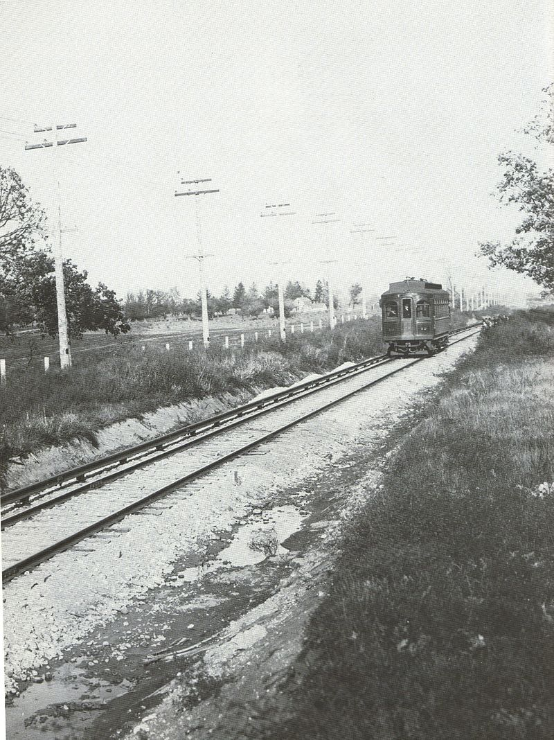 A 1902 photo of a CA&E train southwest of Wheaton. Note the “third rail” running alongside the two tracks. The third rail provided electrical power to power and make the train run on the track. (Source: Wikipedia: https://en.wikipedia.org/wiki/Chicago_Aurora_and_Elgin_Railroad)
