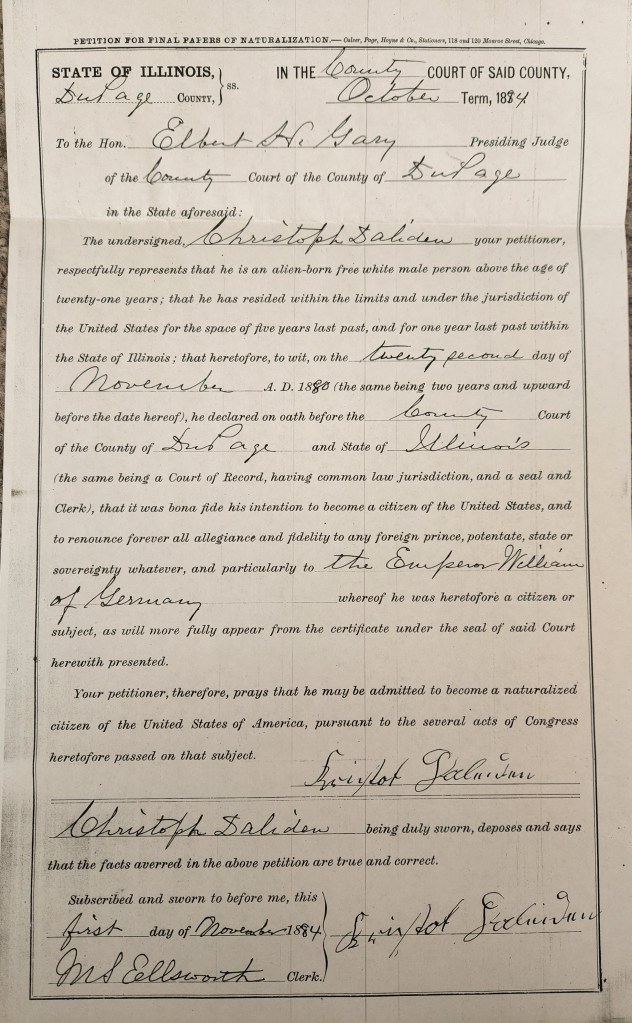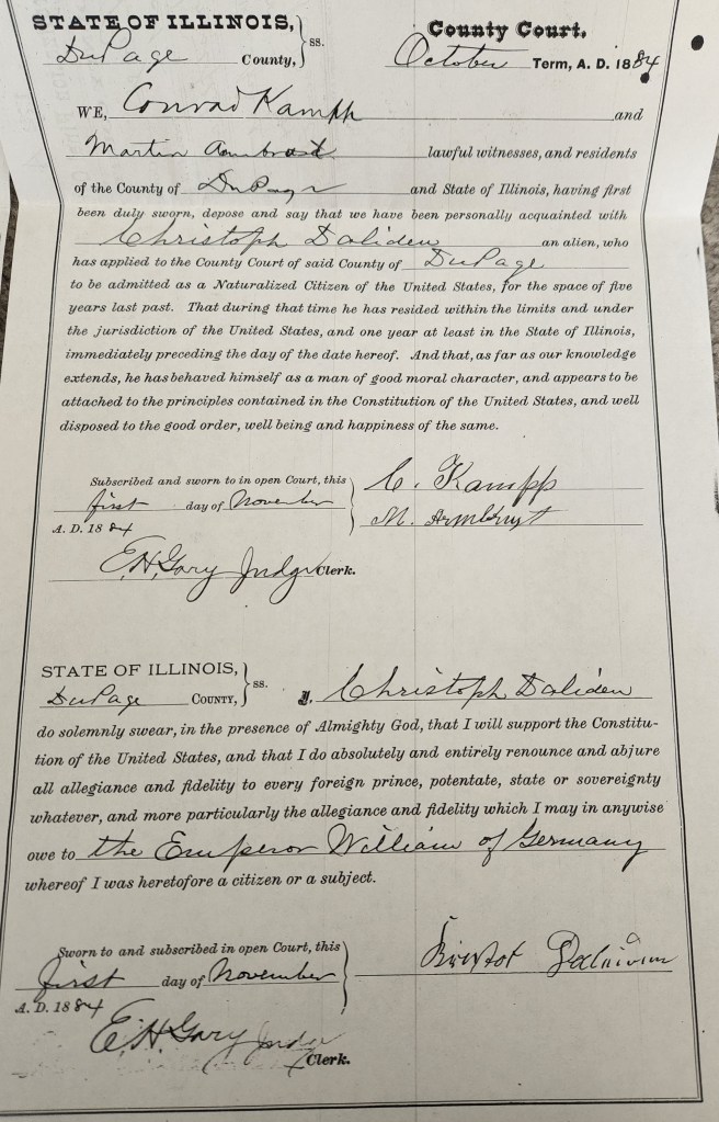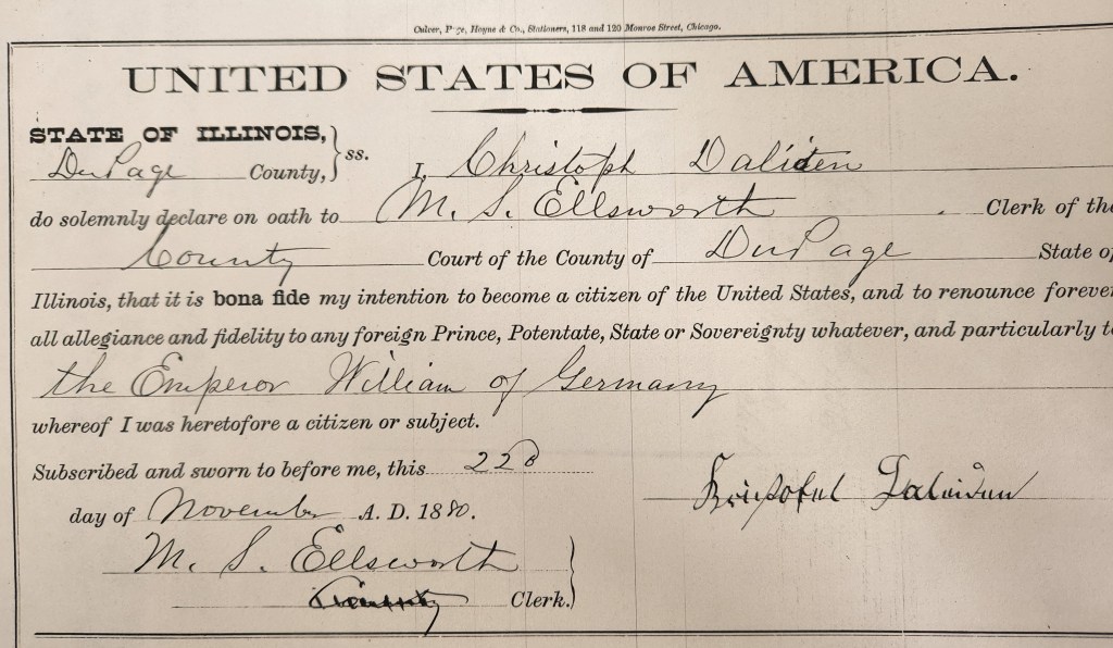 The above document from the DuPage County Clerks office show Matthias Daleiden’s signature on a Declaration of Intent to file Naturalization Papers. The date of filing was on 13 October 1856. Shows him announcing his renunciation of affiliation with the Prussian King. Matthias was the father of Christopher and Michael Daleiden. He was the patriarchal head of the Daleiden family.