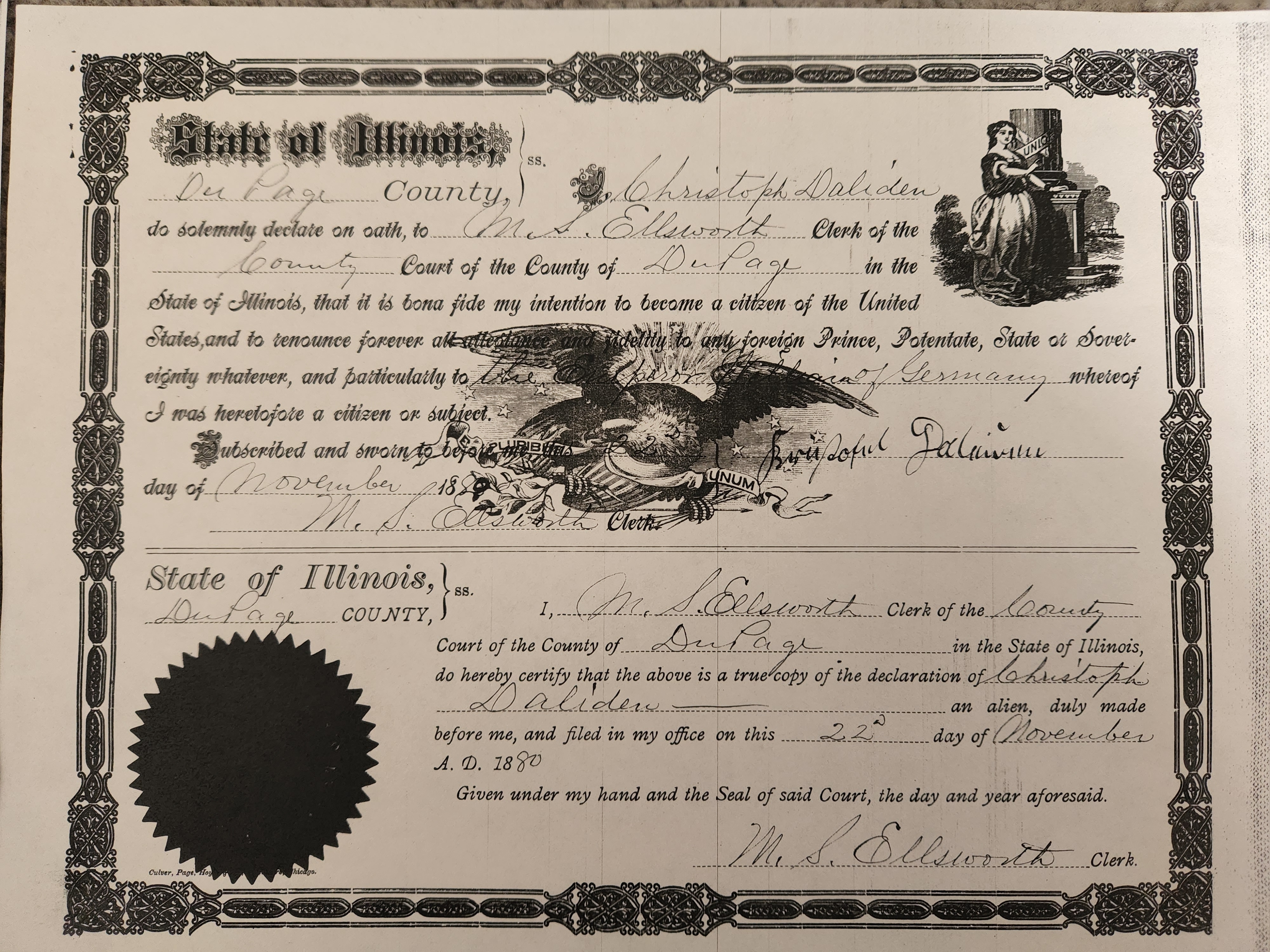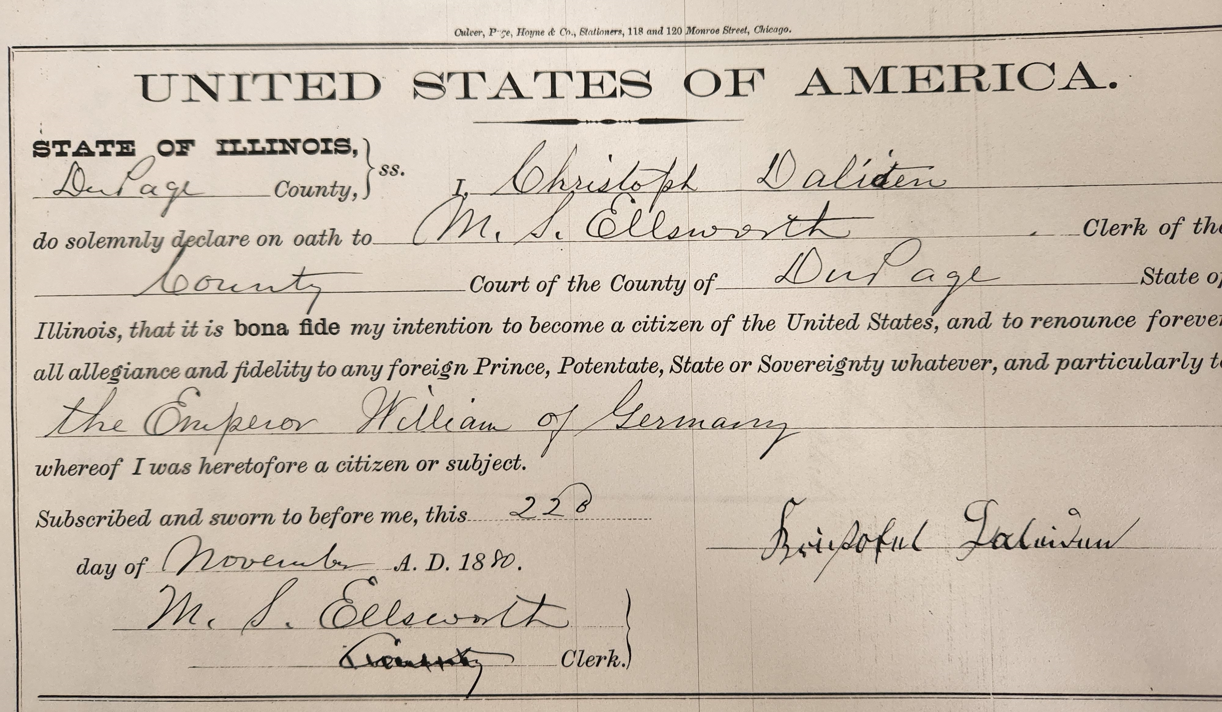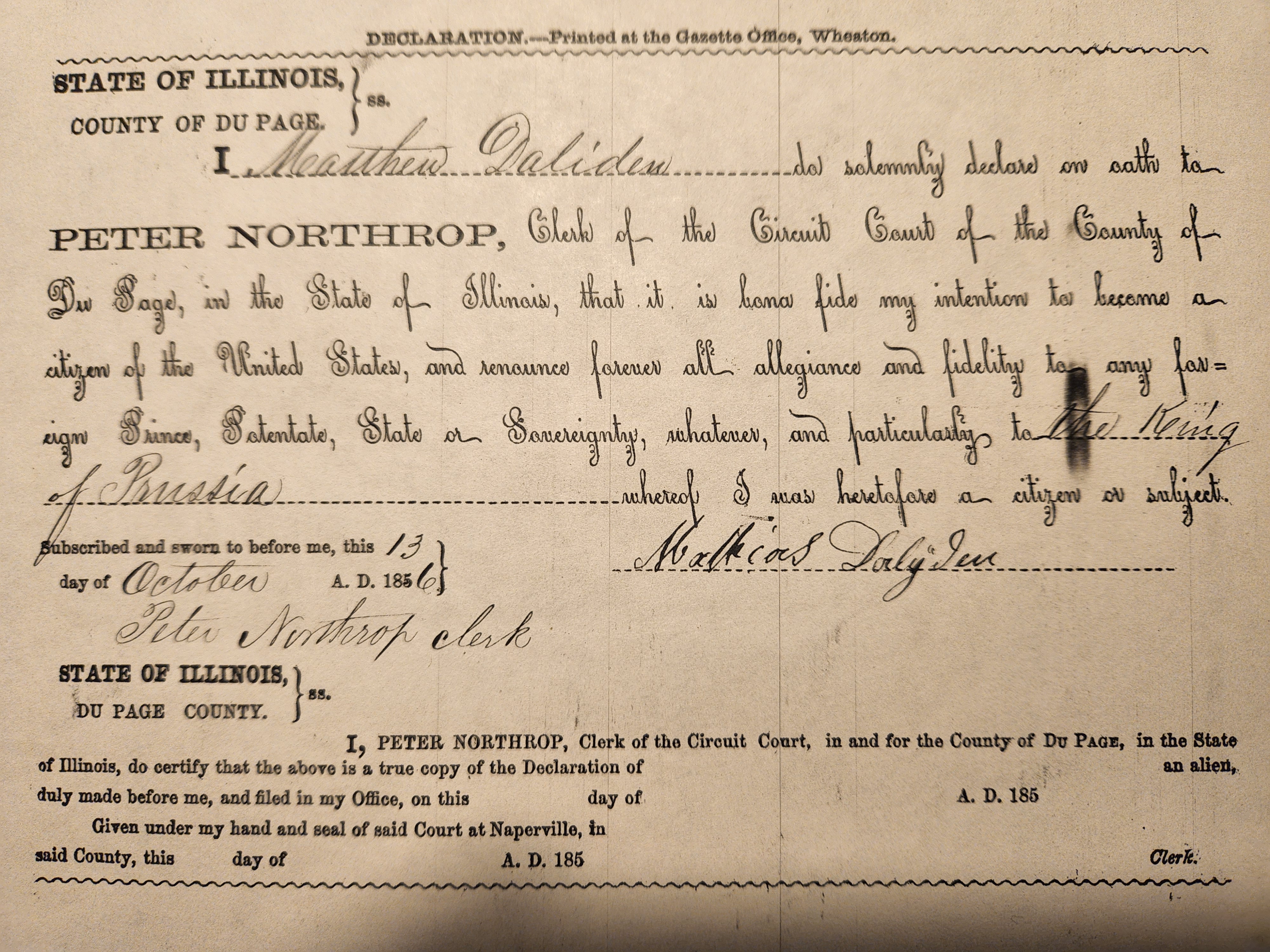 The above document from the DuPage County Clerks office show Matthias Daleiden’s signature on a Declaration of Intent to file Naturalization Papers. The date of filing was on 13 October 1856. Shows him announcing his renunciation of affiliation with the Prussian King. Matthias was the father of Christopher and Michael Daleiden. He was the patriarchal head of the Daleiden family.