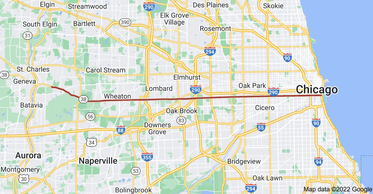 Roosevelt Road (Illinois State Route 38) runs from Chicago near the shores of Lake Michigan west to the City of Geneva and to points further west. It is one of many commercial transportation routes for the suburbs.