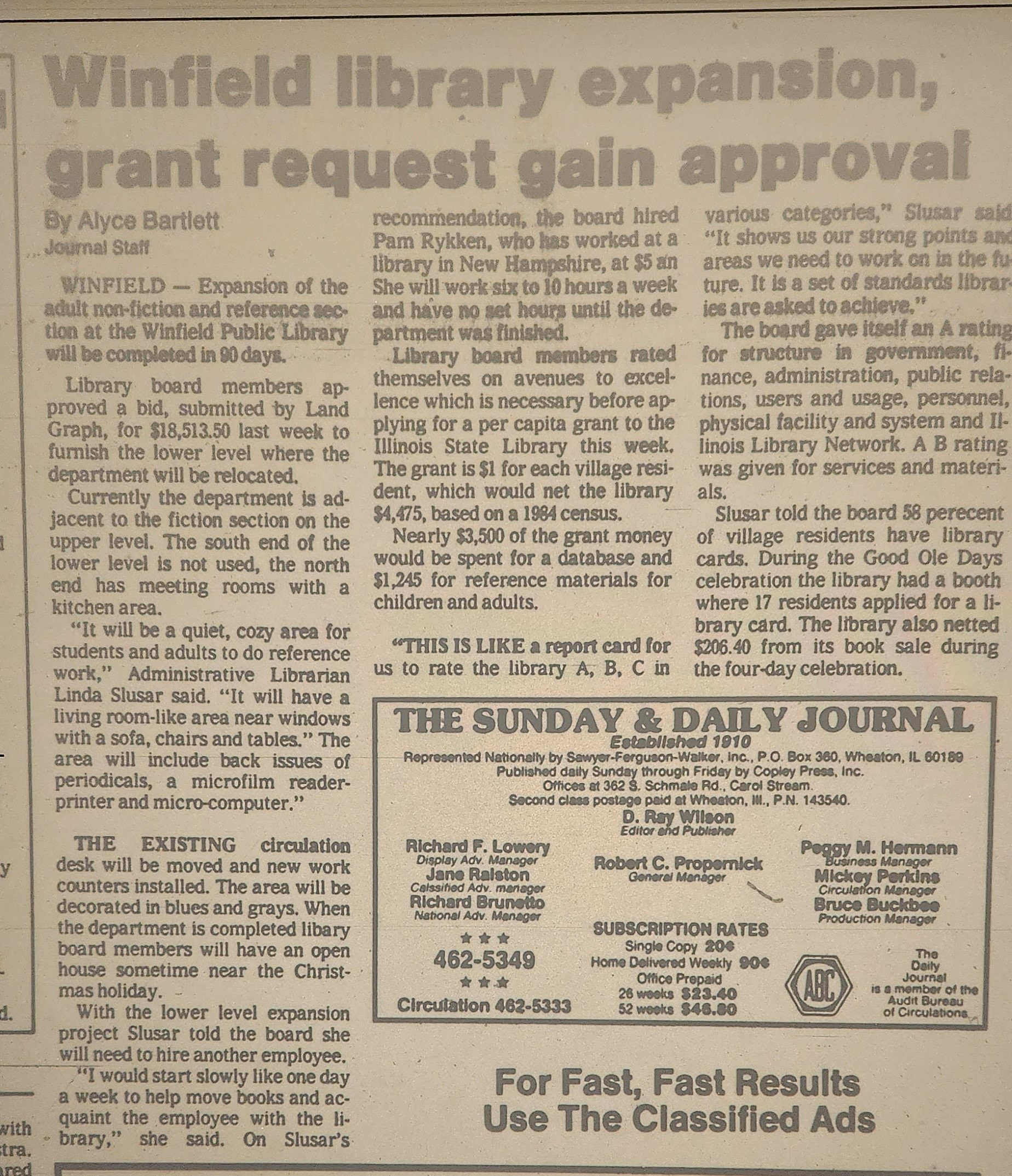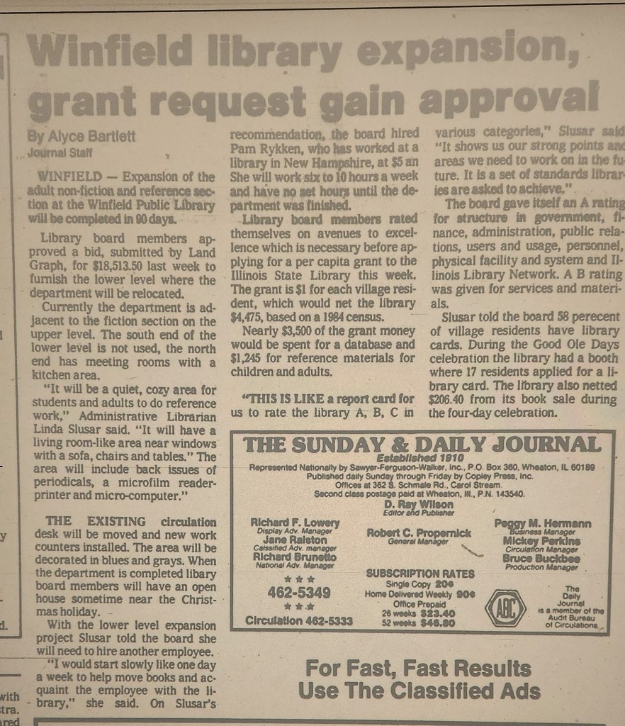 In a recent review of old issues of the Wheaton Daily Journal for the year 1986 I ran across the article below concerning the renovation or expansion of the current Library building under the leadership of Linda Slusar. Linda would later become the leader of the College of DuPage Library Technical Assistants Certification program. I would beome an instructor for the program for a short period of time in the nineties while I was working for the Warrenville and Aurora Public Libraries and prior to becoming the Administrator for the Messenger Public Library of North Aurora Illinois.